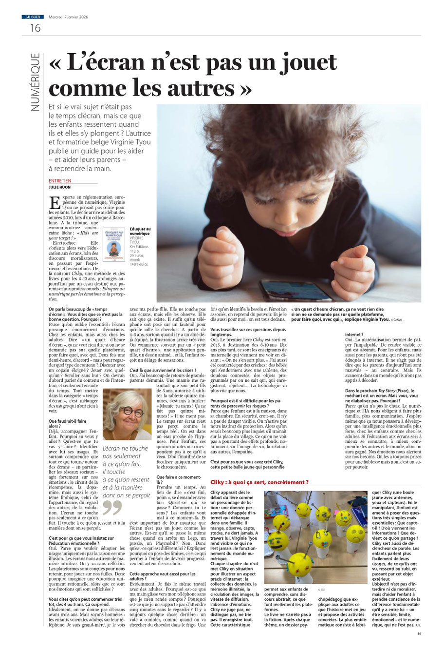 En quoi cette trilogie romanesque peut-elle vous être utile à vous, parent ? Elle vous permet d’abord de donner une forme physique à un univers qui n’en a pas. La matérialisation du numérique permet de prendre du recul et d’éveiller le questionnement de l’enfant à son sujet. Ensuite, la place de Cliky dans la famille Duraisau permet d’évoquer les différentes situations que les enfants vivent quotidiennement avec leur écran. Ainsi, vous pouvez instaurer avec votre enfant un dialogue sur les usages de Cliky (l’écran) et leur impact sur ses émotions.