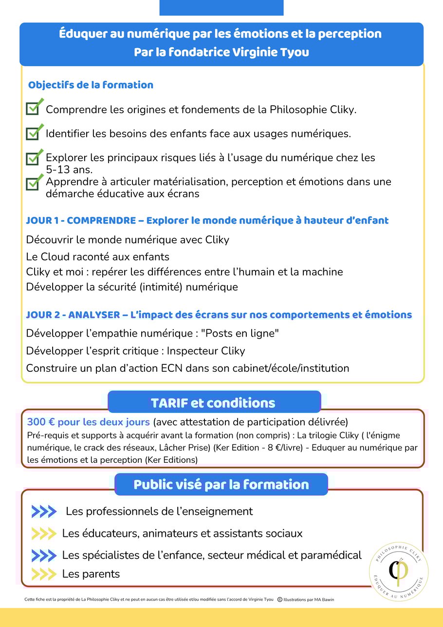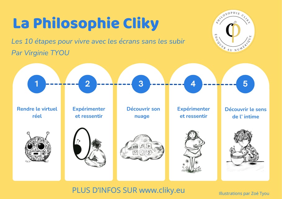 Dans un monde en pleine révolution technologique, l’important n’est pas d’apprendre des règles préconçues (qui seront très rapidement périmées), mais bien de réfléchir à la manière dont nous souhaitons vivre notre cyber citoyenneté. Cliky constitue votre atout réflexion autour de l’écran !
