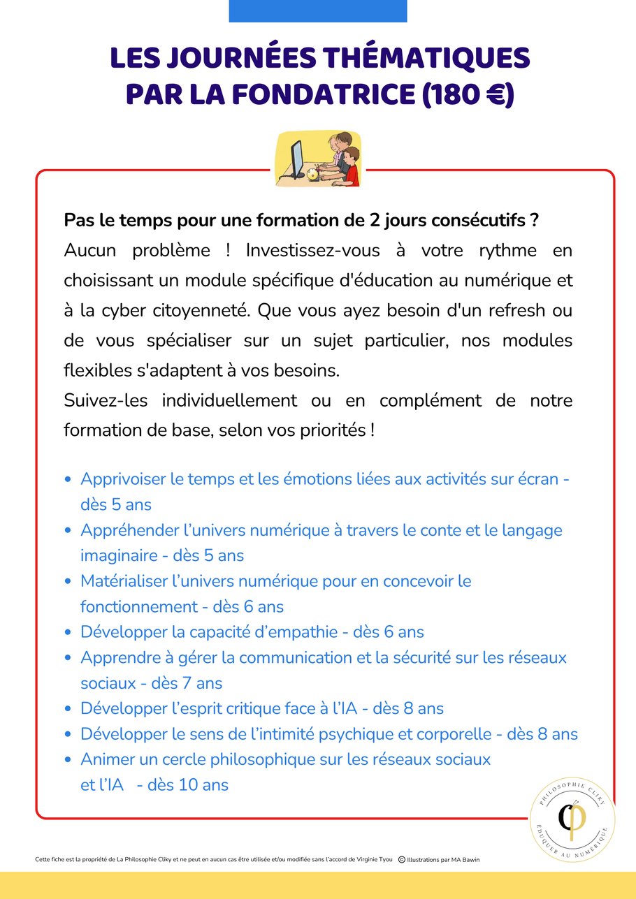 Les formations "Philosophie Cliky" offrent aux enseignants et éducateurs des outils pratiques et concrets pour transformer leurs cours en véritables leviers de changement. Vous apprendrez à transmettre les compétences clés qui donneront à vos élèves les moyens de naviguer avec confiance dans le monde numérique, tout en les sensibilisant aux enjeux sociétaux, éthiques et personnels qu'il implique.
